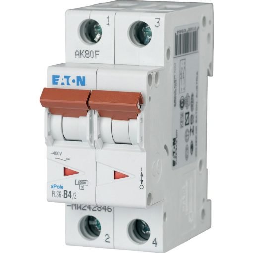 Eaton Moeller series xPole – PLS6/M MCB. PLS6, 2-pole, tripping characteristic: C, rated current In: 4 A, rated switching capacity IEC/EN 60898-1: 6 kA