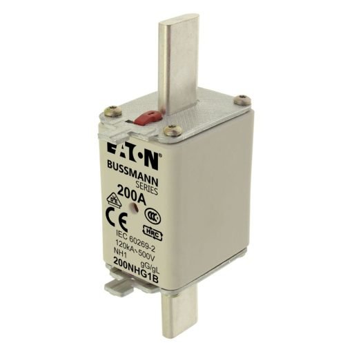 Eaton Bussmann series low voltage NH Fuse, Live gripping lug, 500V, 200A, 120 kAIC, Combination fuse status indicator, Blade end connection, Class C gL/gG, Square-body with knife blade contact, Ceramic body